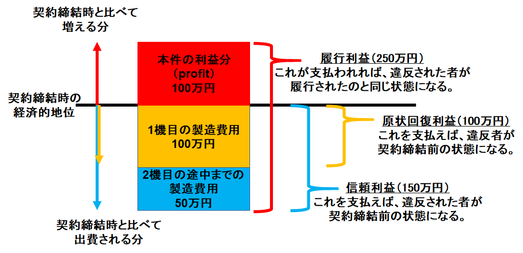 あくまで、履行利益は、その契約が履行されたならば到達していたはずの経済的地位に違反された者を置くことを目指すものなので、50万円の出費を契約解除で免れたからには、履行利益はこの分を差し引いた250万円となるのです。実際、この場合、製造費として出費された150万円を250万円から差し引けば、残りは100万円となり、これは、2機製造して納入した場合の請負人Aの到達した経済的地位と同じになります。