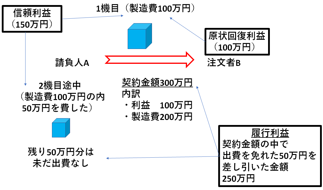 次に、請負人Aは、既に1機目を製造して納入し、さらに2機目にも50万円の費用をかけています。これは、「契約がなかったならば、請負人Aが出費しなかった費用」です。つまり、請負人Aが契約締結前の経済状態に戻るためには、この分を支払ってもらう必要があります。これが信頼利益です。これは、別の言い方をすれば、「契約が履行されると信頼したために出費することになった金額」です。よって、この信頼利益は、1機目の製造費全額=100万円と、2機目の途中までの製造費50万円の合計150万円となります。
