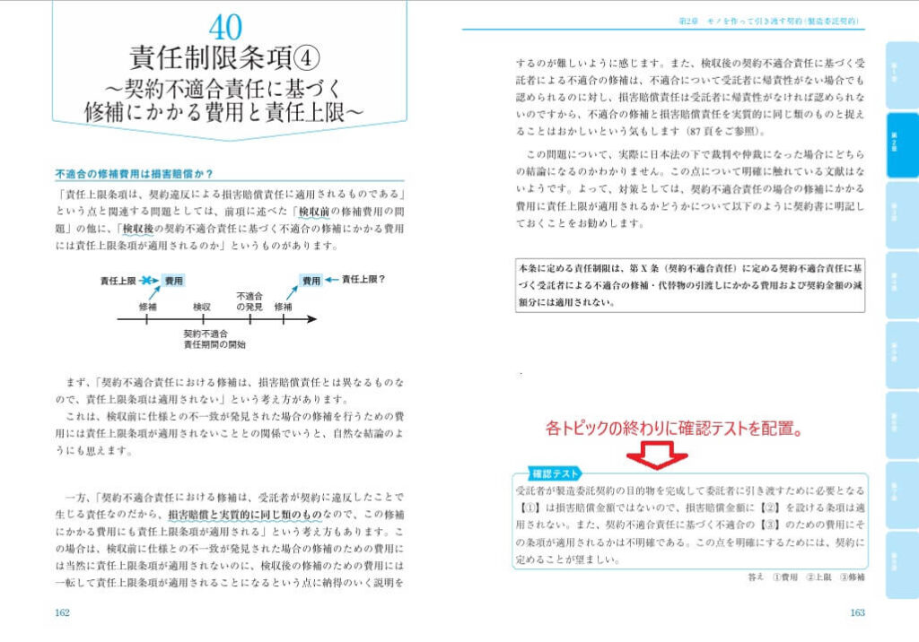 【類書と比較した際の本書の特徴】 たとえば、「製造委託契約(業務委託契約)」において、 ・「損害賠償責任を制限する条項」について、8トピック16ページに渡って解説しています。 ・「納期遅延の予定損害賠償金(いわゆるリキダメ)」について、5トピック12ページに渡って解説しています。 ・「民法から修正すべき事項」の一覧表を提示しています。 ・また、販売店契約、ライセンス契約、そして共同研究契約において独占禁止法上問題となる事項について、単に公取委のガイドラインをそのまま示すだけではなく、ガイドラインを読む際の注意事項を指摘しつつ、主に問題となる「競争を回避する行為」と「他者を排除する行為」の観点から、いかなる場合に独禁法違反となるのかを独禁法の初心者にもわかるようにイラストを用いて解説しています。 ・各トピックの終わりに確認テストを置いているので、確実に理解を積み重ねながら読み進めることができます。 ・各トピックを1~4ページで解説しているので、隙間時間を利用してトピックごとに読み進めることができます。 |
