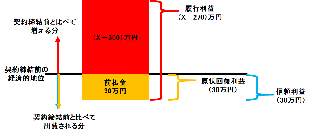 今回の注文者Bは、納入された工作機器を用いて、何らかの仕事をし、それによって利益を得ようと考えていたはずです。仮にその利益をXとしましょう。ここで、注文者Bは、工作機械を300万円で取得し、それを利用することでXの利益を得ようとしていたのですから、注文者Bが、契約が履行されていたならば置かれていたはずの経済的地位は、(X-300万円)といえます。一方、契約を解除した今の時点では、注文者Bの置かれた経済的地位は、前払金の30万円の出費があるので、-30万円となります。